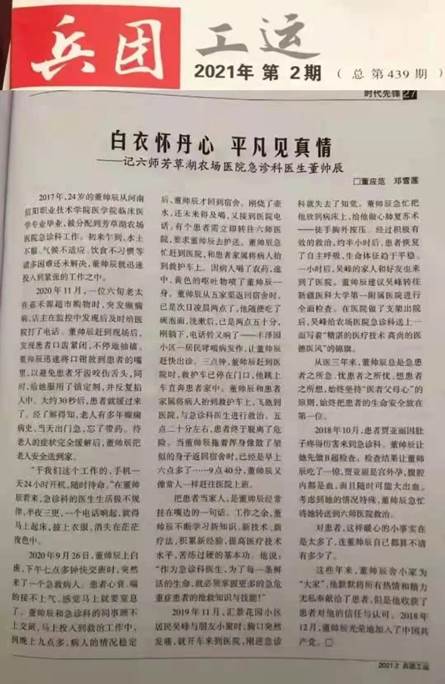董帅辰,中共党员,2017届毕业生。现在就职于新疆生产建设兵团第六师芳草湖农场医院急诊科,2021年个人事迹被刊登到《兵团工运》。