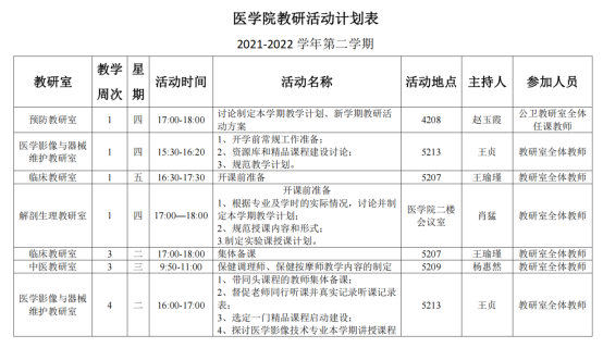 计划的效果关键靠落实,在学院领导的支持下,伟德国际1946源于英国教务办将持续跟进以上计划的实施,一方面积极配合各教研室做好教学服务工作,为各项活动的开展提供支持,一方面严格监督各教研室按照计划要求认真开展活动,把活动开展情况作为基层教学组织和任课教师评优评先的重要依据。相信公司通过这一系列计划的有效实施,能够有效促进教学秩序的规范,有效促进教学质量的提高,有效促进高质量实用型卫生人才的培养,助力伟德国际1946源于英国高质量、可持续发展。