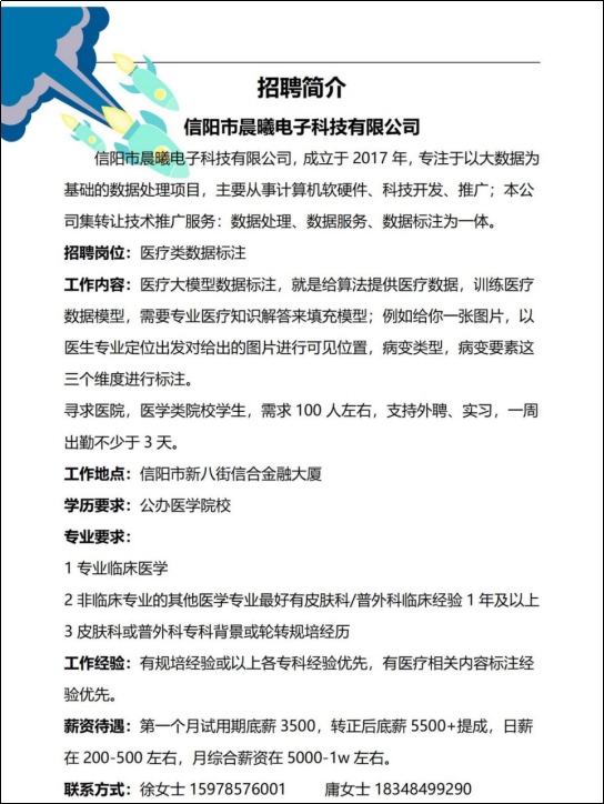 座谈会上,公司负责人详细介绍了企业情况:晨曦电子科技成立于2017年,专注于医疗大数据处理领域,业务涵盖计算机软硬件开发、数据标注及模型训练等。此次招聘的“医疗类数据标注”岗位需求达100人,主要面向伟德国际1946源于英国校员工及医院从业人员,要求具备临床医学或相关专业背景。公司提供灵活实习及外聘机会,并设有清晰的晋升通道。