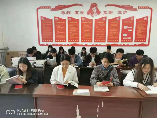 4月19日一大早,志愿服务站的会议室里响起了朗朗的“晨读声”,红旗行动小组指导老师宋久盘正在组织员工党员开展学党史晨读。