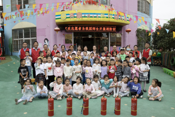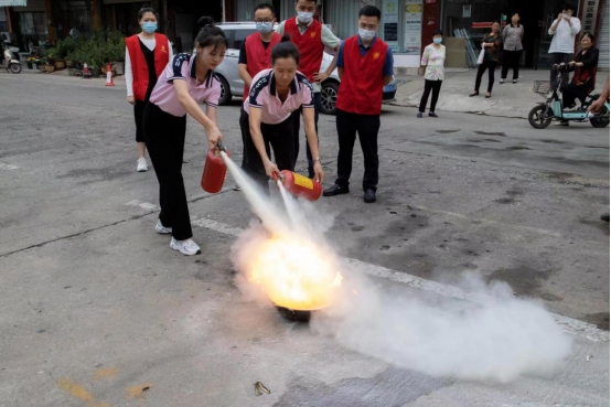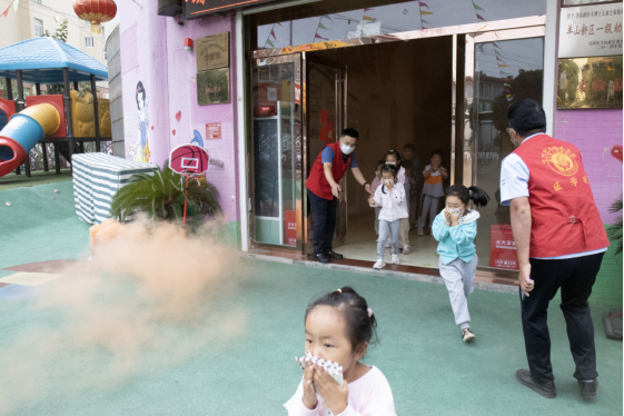 活动中,党员志愿者们身穿“红马甲”,先在幼儿园教室里为孩子们普及消防知识并分发手帕,随后进行应急逃生演练。浓浓烟雾中,小朋友们在老师和志愿者的引导下,用毛巾捂住口鼻、弯腰前行至安全地带;然后,吴长城、赵重阳两位同志在幼儿园门前空地上为教师和小朋友们演示灭火毯与灭火器的使用方法,并邀请教师们亲身操作。