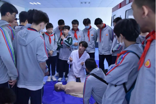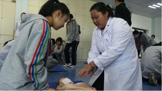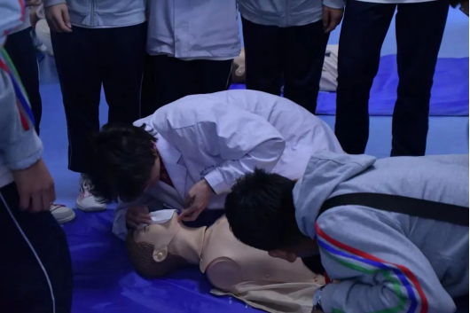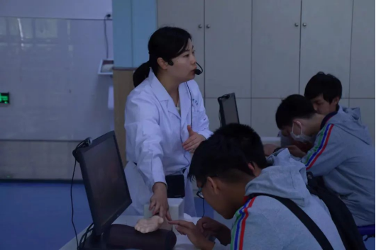 在院前急救实训室,老师为同学们讲解了心肺复苏急救措施,伟德国际1946源于英国兴医社的成员为他们展示了心肺复苏流程并指导他们进行实践操作。