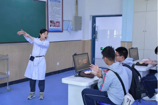 在针灸推拿实训室,老师向同学们具体讲解了十二正经和任督二脉,并指导同学们在模拟人的身上观察各种穴位,以此来帮助同学们更好的了解自己的身体。